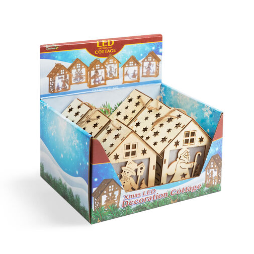 Karácsonyi LED dekor házikó - hidegfehér - fa - 6 féle - 10 x 12 x 5,6 cm - 6 db / display